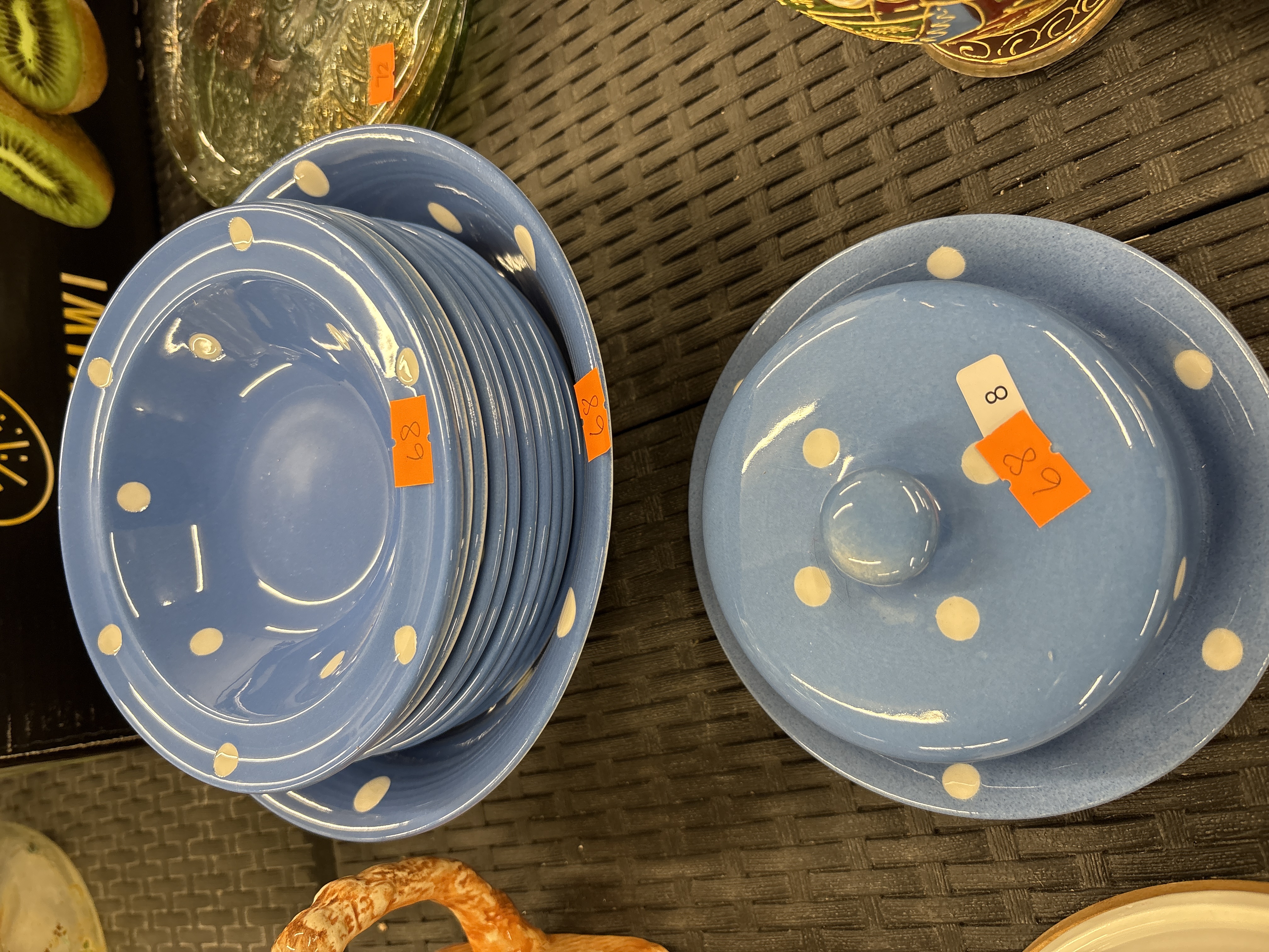 A collection of blue and white polka-dot pattern glazed earthenware tableware. The lot comprises a stack of saucers or small plates, a larger shallow circular bowl, and a circular lidded serving dish featuring a central knob finial. The pieces are decorated with a light sky blue glaze and white polka dots, in the style of the Domino pattern produced by T.G. Green or contemporary handmade equivalents. No factory marks or brand names are visible on the upper surfaces of the items. Several pieces bear orange auction lot stickers.