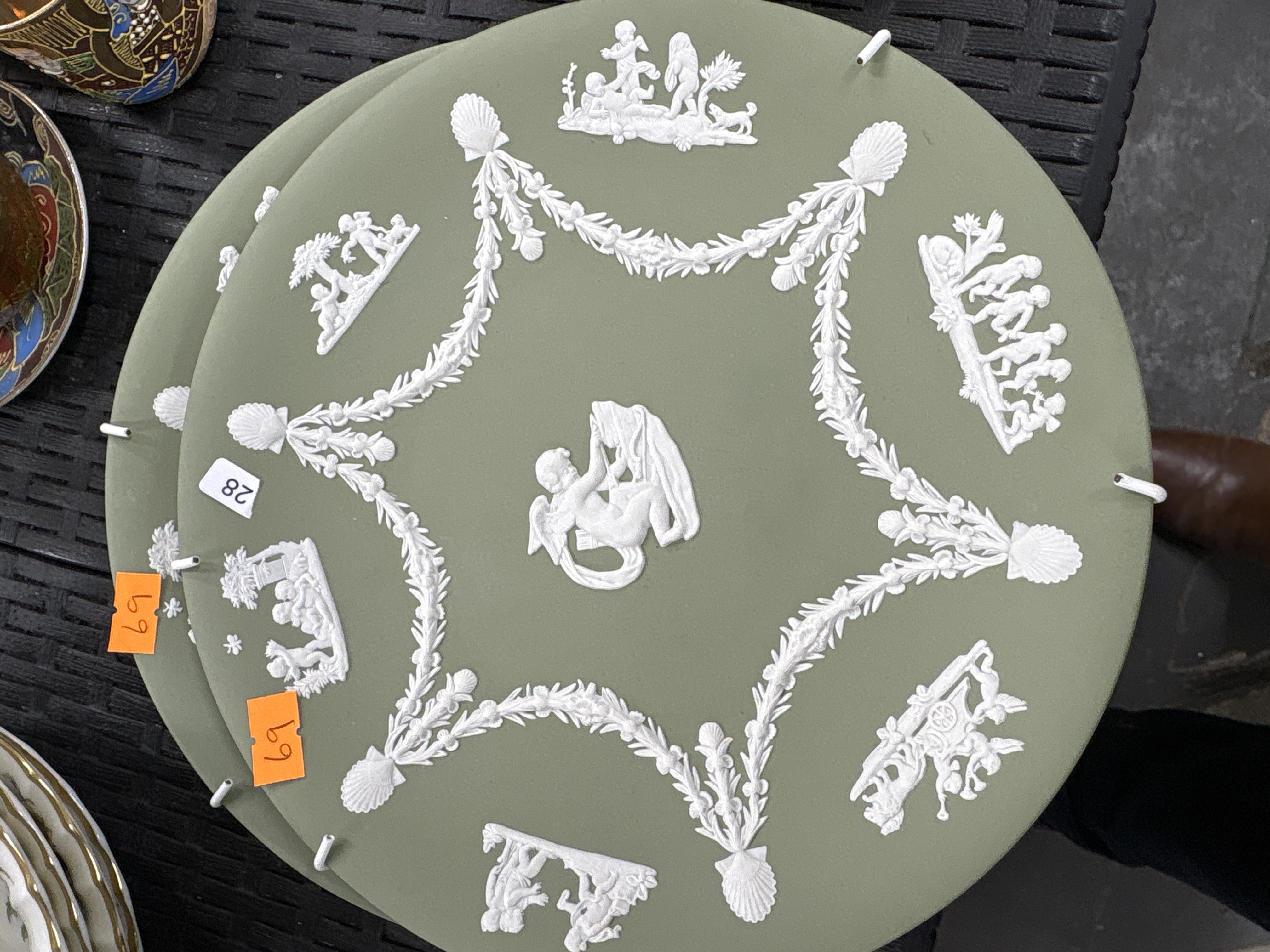 Lot 69: A Pair of Sage Green Jasperware Circular Wall Plates Attributed to Wedgwood