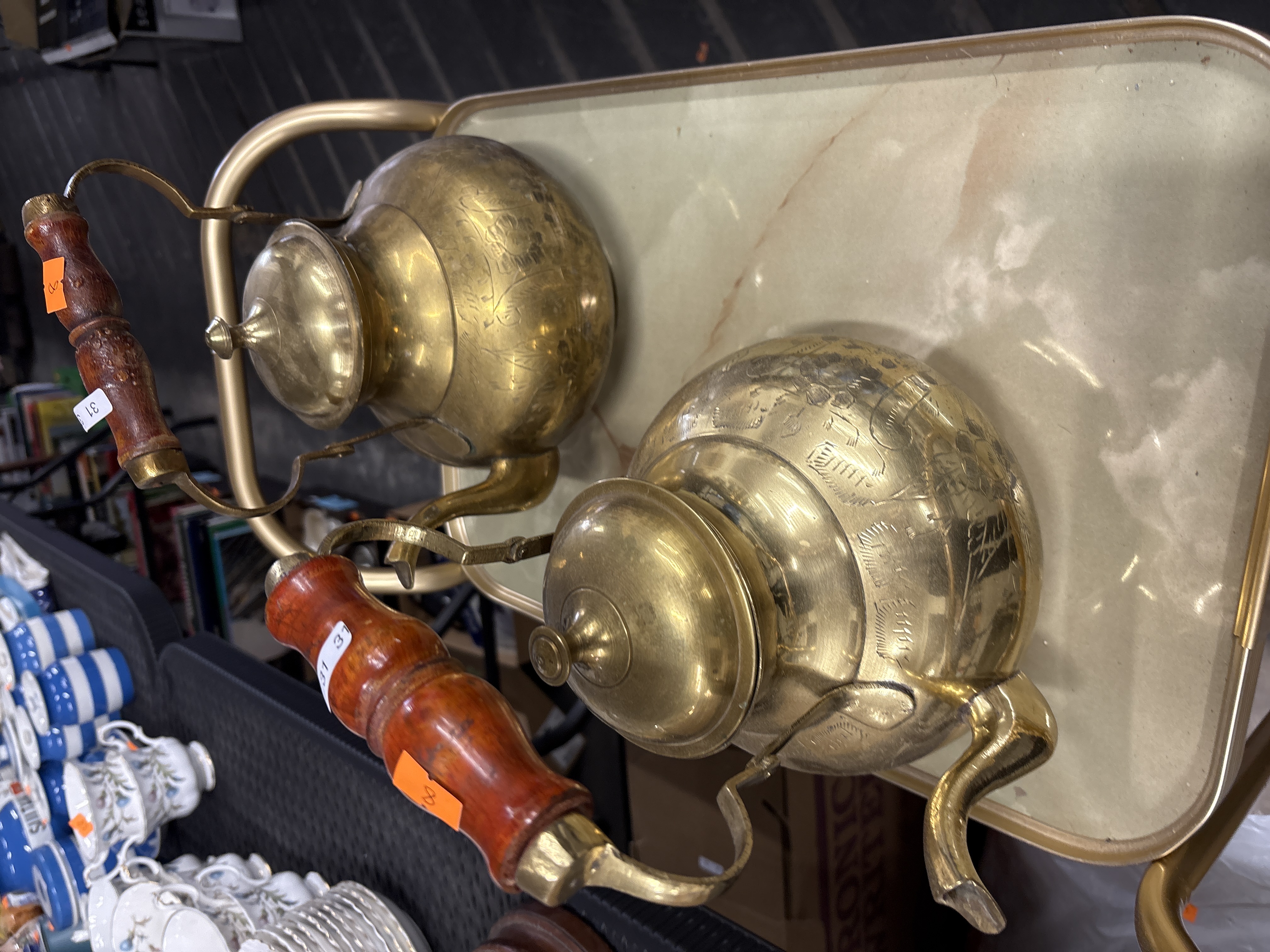 A Pair of Engraved Brass Kettles on a Marbled Stone Tray