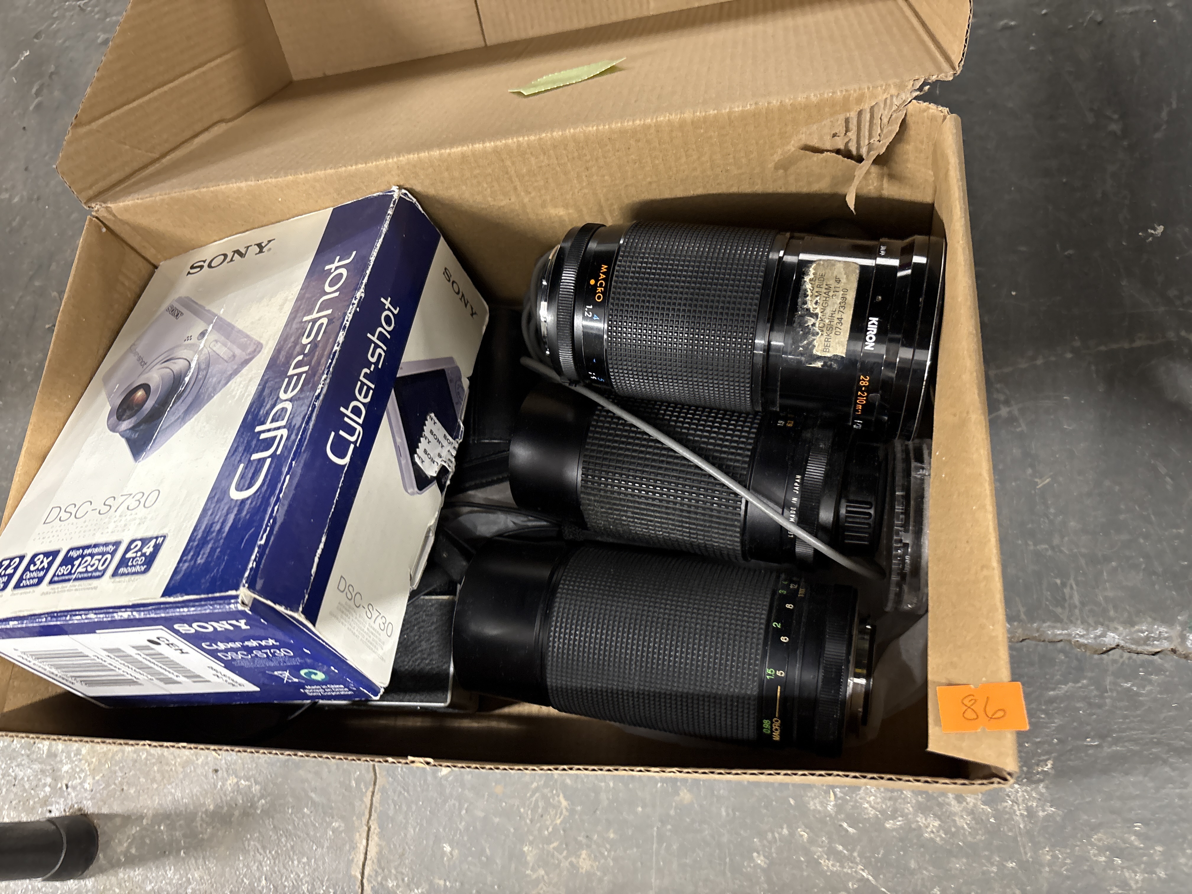 A selection of photographic equipment comprising a digital compact camera and three telephoto zoom lenses. The camera is a Sony Cyber-shot DSC-S730, a 7.2 megapixel digital compact with 3x optical zoom and a 2.4-inch LCD monitor, contained within its original retail box. The accompanying lenses include a Kiron 28-210mm f/4 Macro zoom lens, made in Japan, featuring a black barrel with knurled rubber grips and a local dealer label from Wokingham, Berkshire. The lot further contains two additional Japanese telephoto zoom lenses with knurled rubber grips, one of which features macro capability and a distance scale.