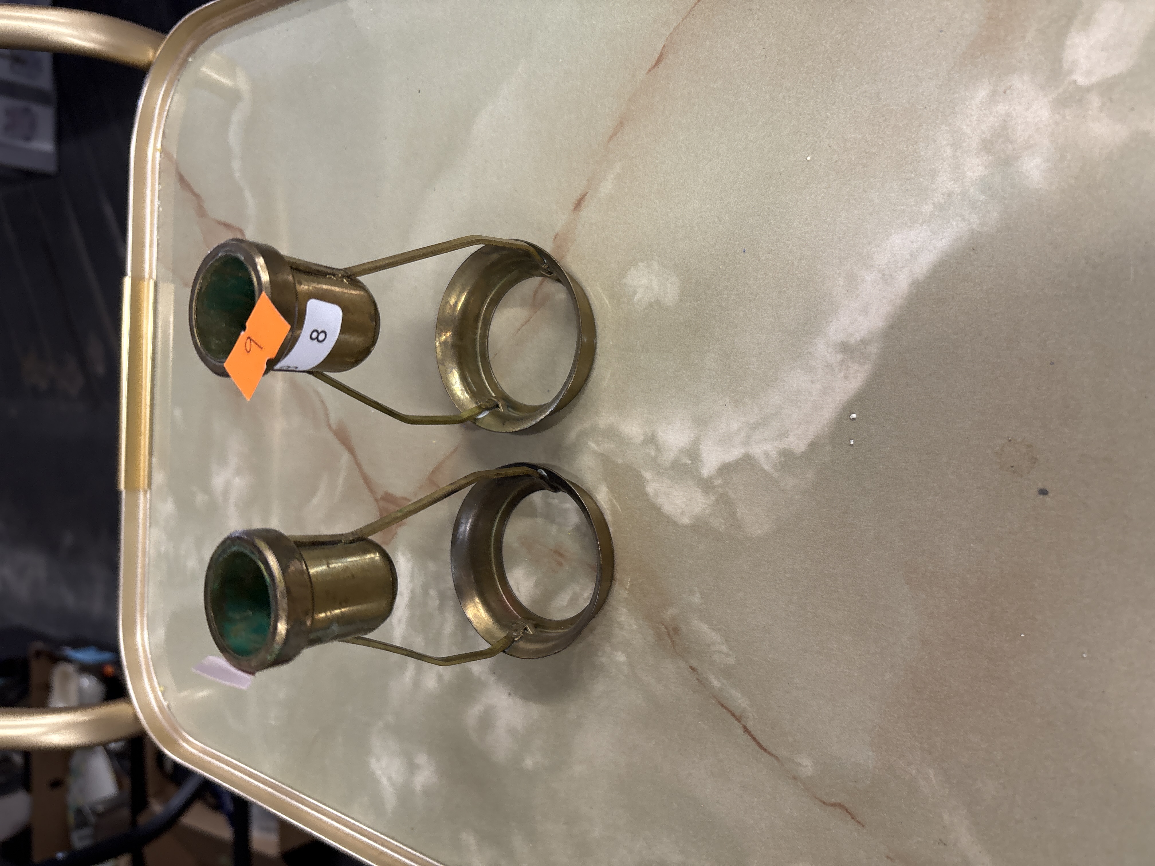 A pair of brass fittings, identified as lamp shade carriers or candle shade adapters. Each item is constructed from formed brass components joined by soldering. The design consists of a small cylindrical socket with a flared rim, supported by two wire-form struts that attach to a larger circular base ring. These fittings are designed to sit over a lighting fixture or candle holder to support a shade. No maker’s marks or manufacturer stamps are visible on the metal surfaces. One item retains two adhesive inventory labels, one white with the digit 8 and one orange with the handwritten digit 9.