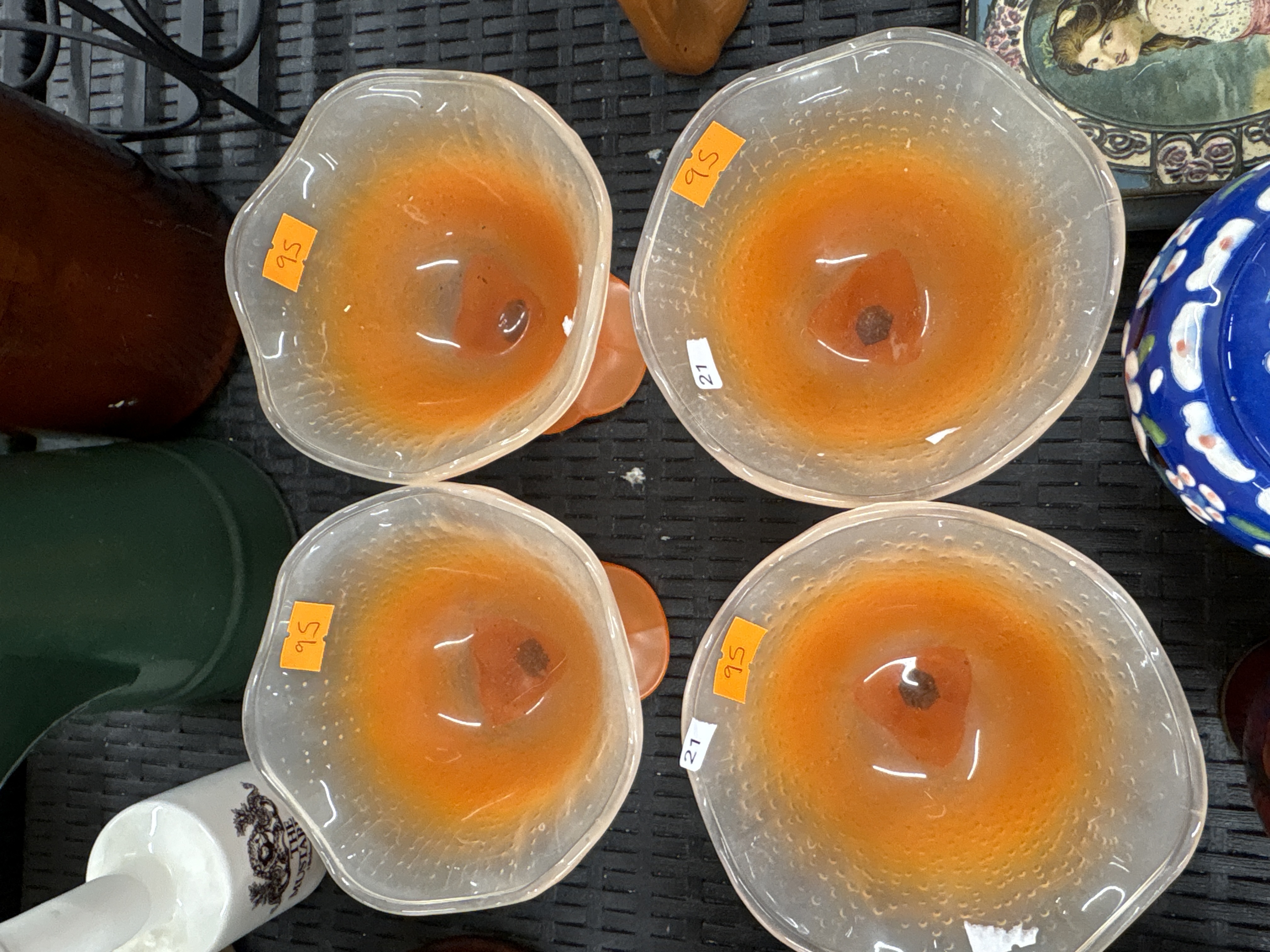 This set of art glass dessert coupes or sundae dishes dates from the mid-20th century. Each vessel is constructed with a clear glass bowl featuring a frosted or acid-etched finish to the upper portion and a flared, undulating rim. The interior well of each bowl displays a vibrant orange-to-amber sunburst colour effect. The exterior surface is decorated with a fine, all-over stippled or pinhead hobnail texture, resembling the bullicante technique. The bowls are supported by short, plain stems on circular, slightly domed feet made from solid amber-coloured glass. A dark, irregular inclusion or pontil mark is visible at the centre of each bowl. The style and execution are consistent with European art glass production from the 1930s to 1950s, showing characteristics associated with mid-century British or Murano glassworks.