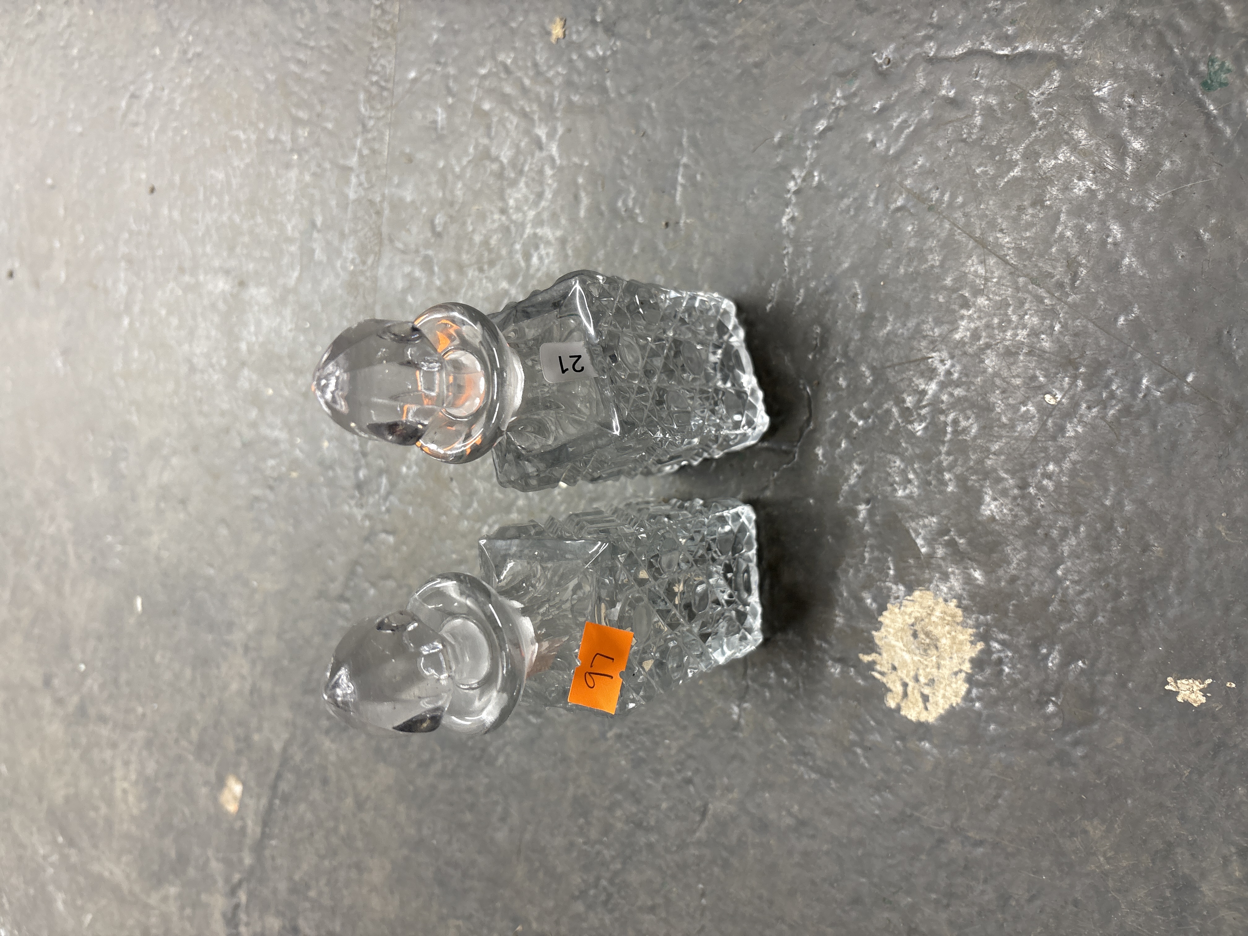 A pair of small lead crystal scent bottles or decanters of square-bodied form. Each piece features deep geometric diamond-cut or cross-hatched patterns to the body, with plain, polished shoulders and short necks. The matching stoppers are multi-faceted and taper to a point. The glass exhibits high clarity and sharp, well-defined edges characteristic of lead crystal. No maker’s marks are visible on either piece; they are in a traditional style common to British and Irish glassware of the late 19th or 20th century. One bottle bears a white adhesive label numbered 21, and the other bears an orange adhesive label numbered 97.