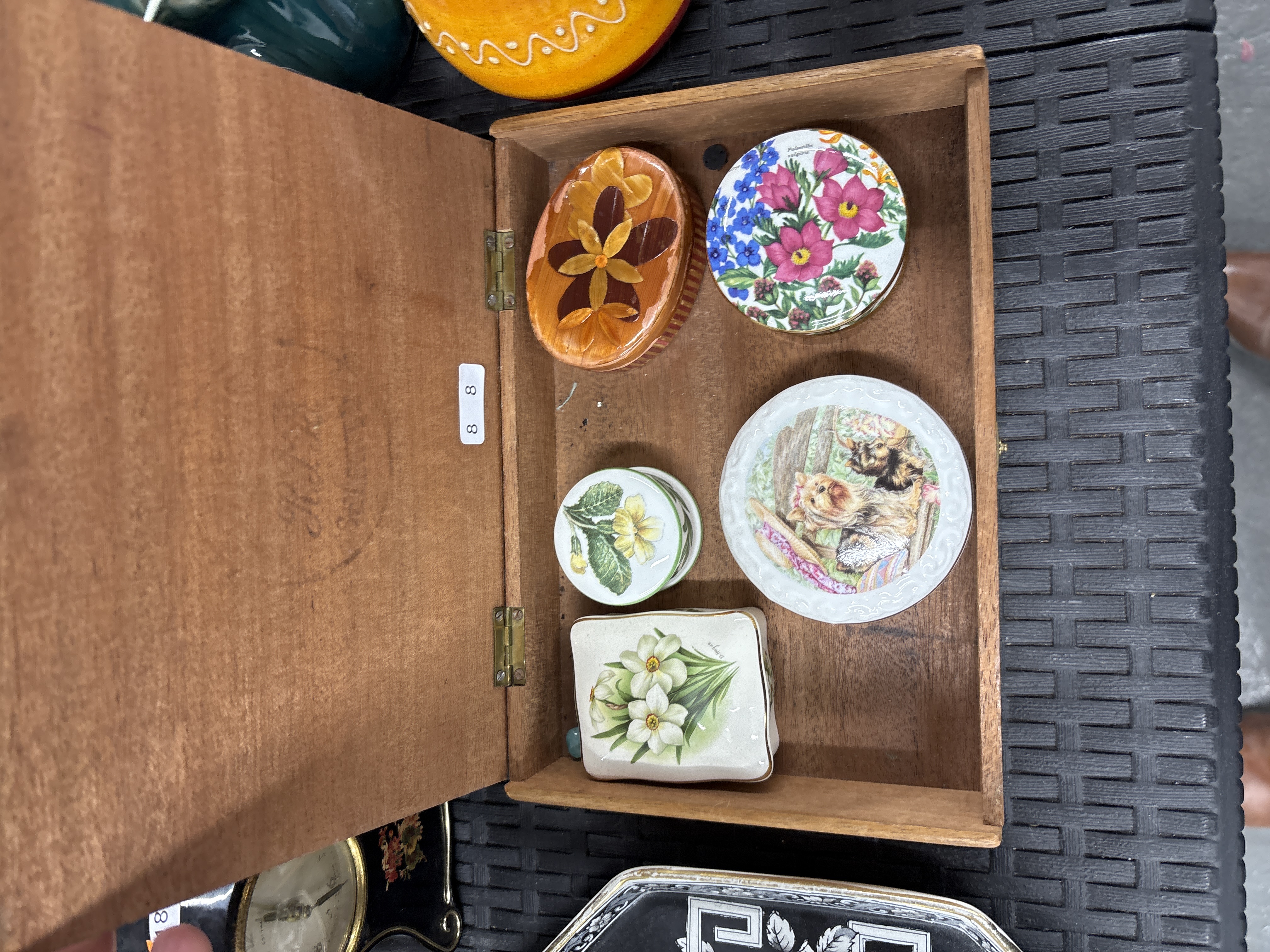 An assortment of decorative items housed within a rectangular wooden box with a hinged lid. The group includes an oval wooden box with a four-petal floral marquetry inlay on the lid. The ceramic items consist of several small boxes and lids, including a circular lid featuring a botanical transfer print of various flowers inscribed with the name Pulsatilla vulgaris. A rectangular ceramic box is decorated with a white floral design and bears a signature to the lid that appears to read Drayton. The collection also contains a circular ceramic dish or lid with a transfer-printed scene of two dogs and a small circular ceramic box with a yellow floral design. The interior of the main wooden box lid displays a small white label numbered 8 8.
