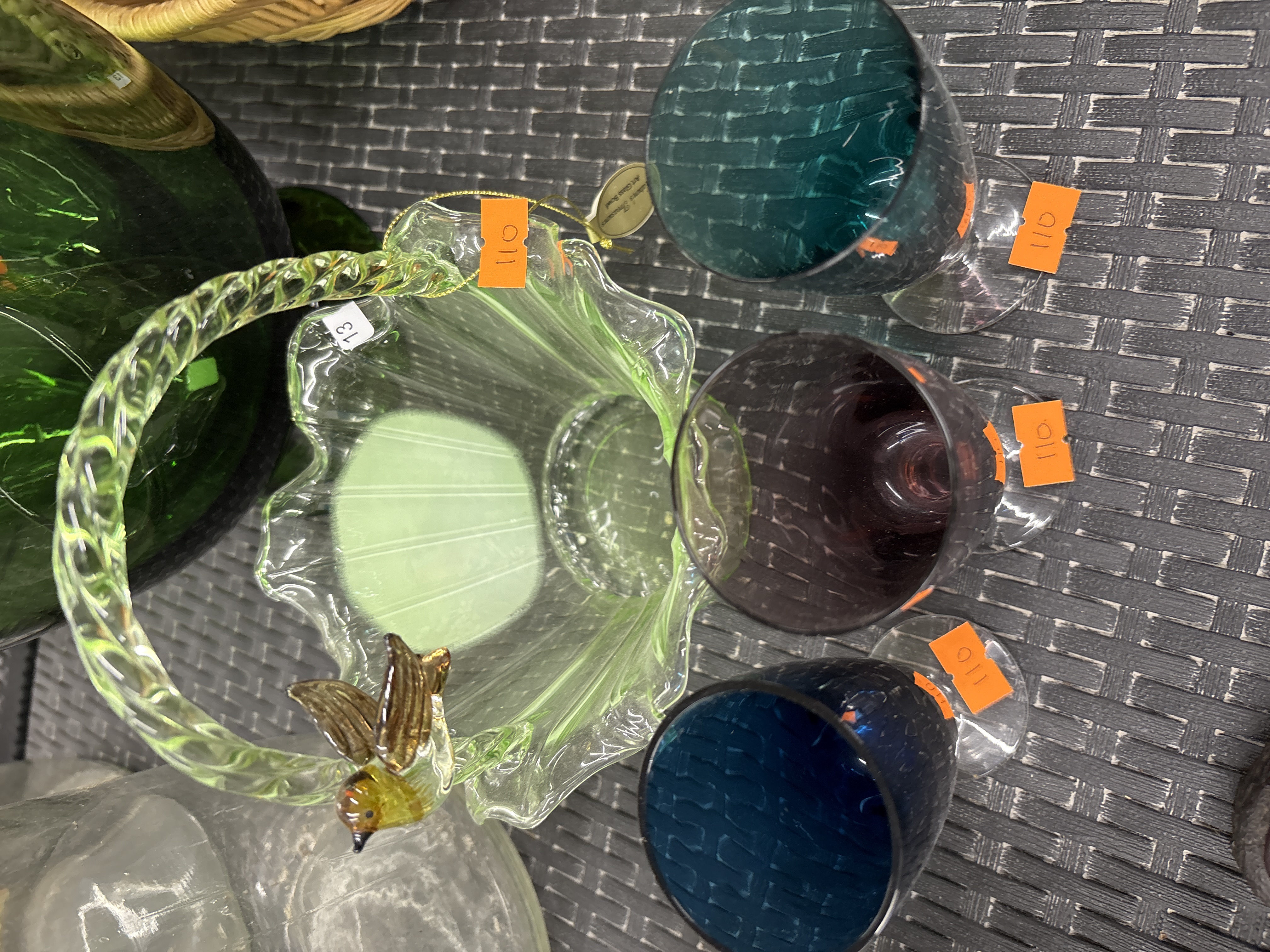 This collection of decorative glassware features a pale green art glass basket and a set of textured wine glasses. The basket is crafted from pale green blown glass with a fluted, scalloped rim and a twisted glass handle, decorated with an applied glass bird figurine in shades of yellow, amber, and brown. It retains a gold-coloured circular tag for Nature’s Treasures. The wine glasses are finished in teal, deep purple, and cobalt blue. Each glass features a bowl with a moulded honeycomb or basket-weave texture, set upon a clear glass stem and a circular foot.