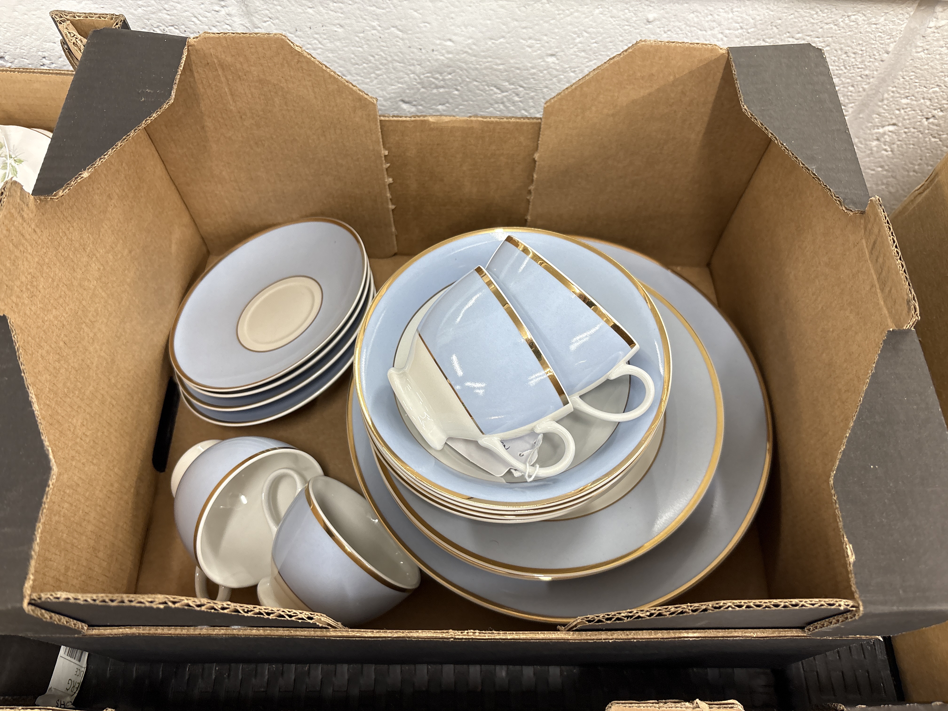 A set of ceramic tableware featuring a mid-20th-century aesthetic, attributed to Royal Doulton. The pieces are decorated with a pale powder blue ground colour on the exteriors and rims, contrasted with white interiors and centres. Each item is finished with a double-banded gilt trim on the rims. The collection consists of several tea or coffee cups with loop handles and tapered bodies, matching saucers with white centres, side plates, and larger dinner or luncheon plates. The items are constructed from fine bone china or porcelain. No manufacturer marks are visible on the bases of the items shown in the provided image.