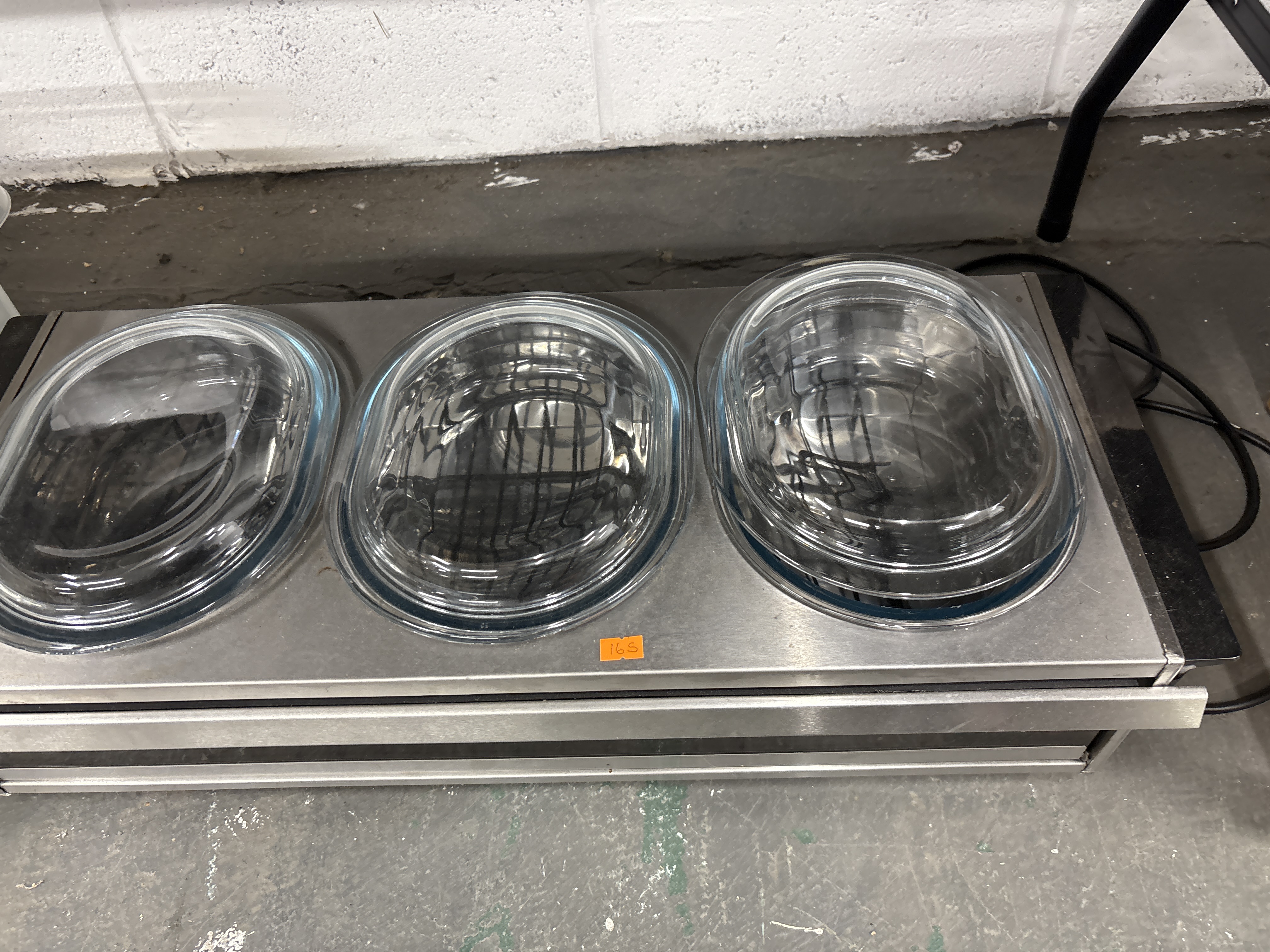 A Hostess tabletop buffet server, identified by visual consensus as model HO392. The unit features a brushed stainless steel chassis with three recessed stations. It includes three oval glass dishes with corresponding glass lids. The appliance is powered by a fixed electric cord for UK mains supply. This model is designed to maintain food at serving temperature for buffet-style dining. No NSF certification is present.