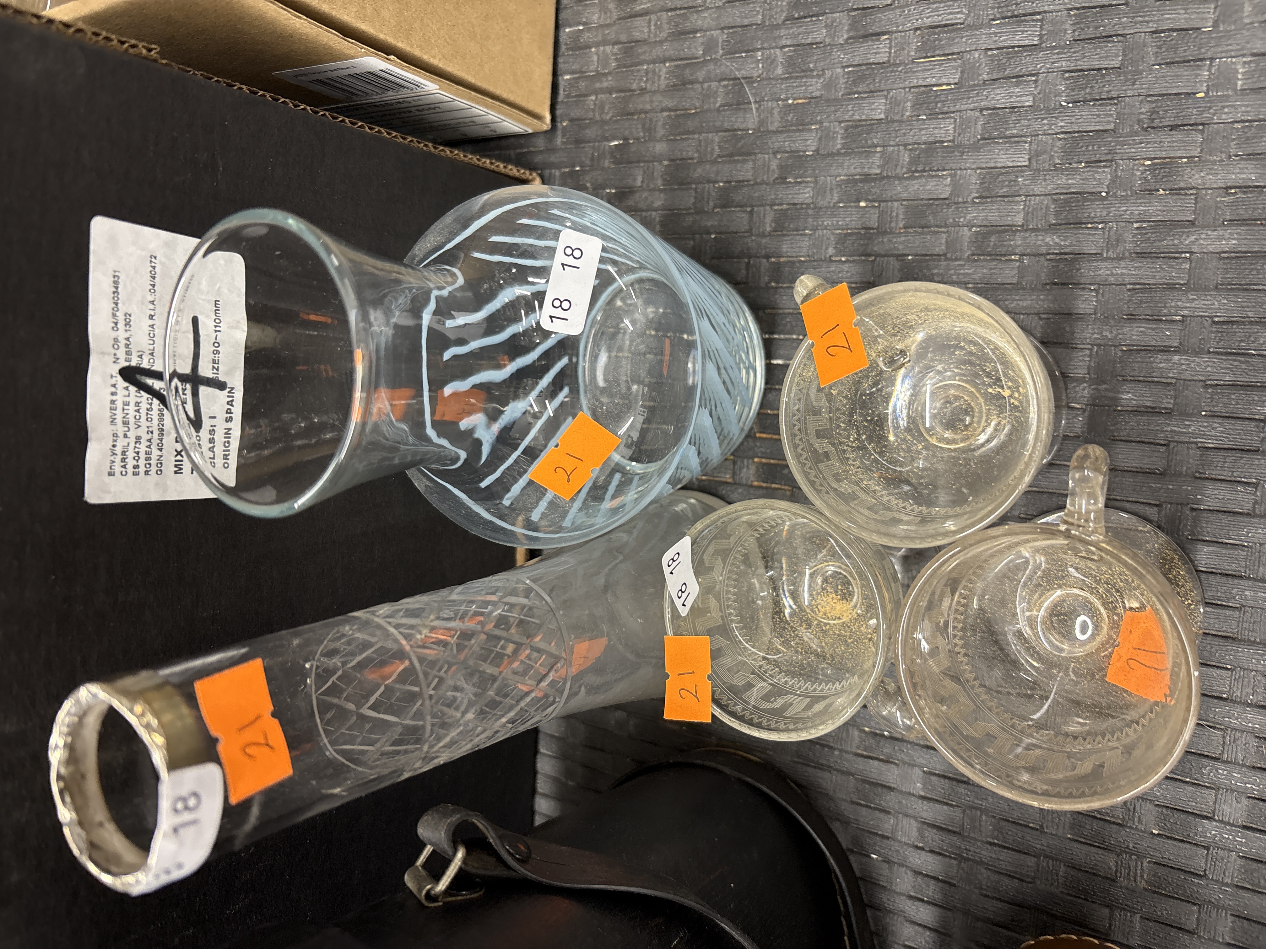An assortment of decorative glassware including a bulbous glass carafe attributed to Blenko Handcraft, model 8318. The carafe is crafted in clear glass with a light blue tint and decorated with an irregular pattern of vertical white trailed lines. The collection also features a tall tapered glass vase featuring an etched lattice pattern to the exterior and a contrasting orange and red grid-like pattern to the interior, finished with a polished white metal collar at the rim. The group is completed by clear glass handled cups, each decorated with a frosted etched band featuring a classic Greek key meander pattern positioned just below the rim. No maker marks, signatures, or factory stamps are visible on the base or body of any of the items; various adhesive inventory labels are present.