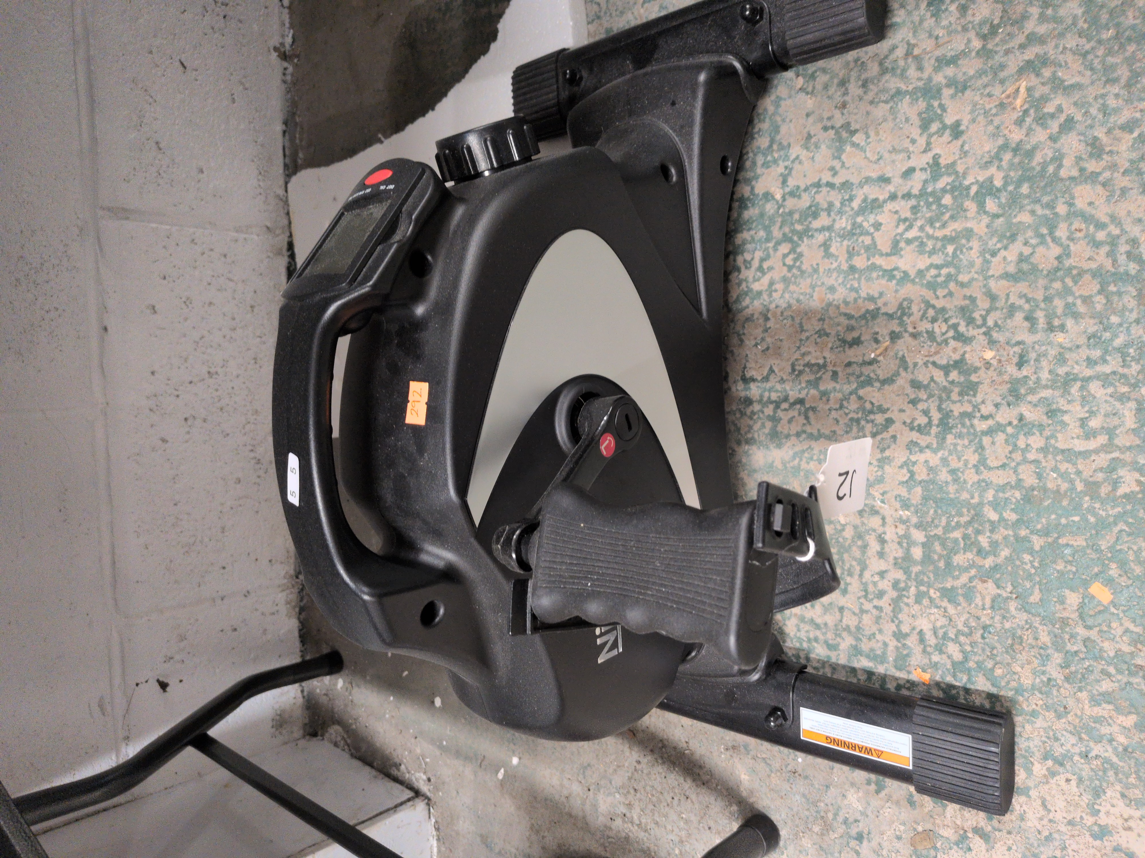 A single compact pedal exerciser, also referred to as a mini exercise bike, designed for seated aerobic activity. The unit features a black plastic housing with a silver-toned side accent and an integrated digital display monitor at the top for tracking exercise metrics. The side of the main housing displays the characters Z and N in a stylized font. The device is equipped with two textured pedals featuring adjustable rubber foot straps and a large manual tension adjustment knob located below the handle. A yellow and white label on the front stabiliser leg includes a warning notice. Several inventory and auction tags are visible, including an orange sticker with the characters 292, a small white sticker with 5 5, and a hanging tag marked with 21. No original packaging or additional accessories are present.