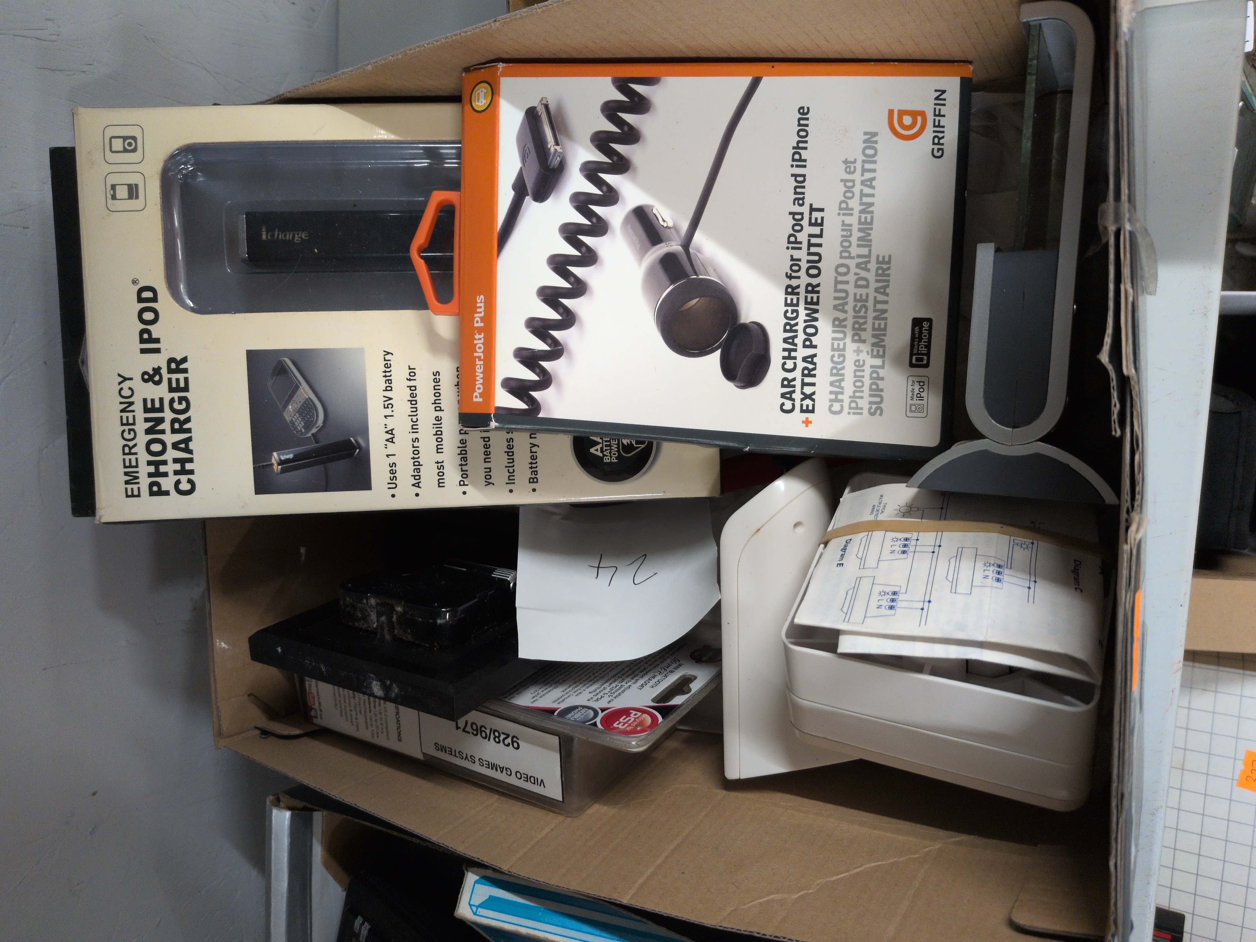 A collection of various electronic accessories and hardware. The group includes an iCharge emergency phone and iPod charger in original packaging, which states it utilises a single 1.5V AA battery and includes multiple adapters. Also present is a boxed Griffin PowerJolt Plus car charger for iPod and iPhone, featuring an integrated extra power outlet. The collection further contains a black plastic base for a video game accessory, positioned on packaging indicating compatibility with PlayStation 3 and bearing the reference number 928/9671. Additionally, there is a white plastic electrical housing or bracket with attached wiring schematics.