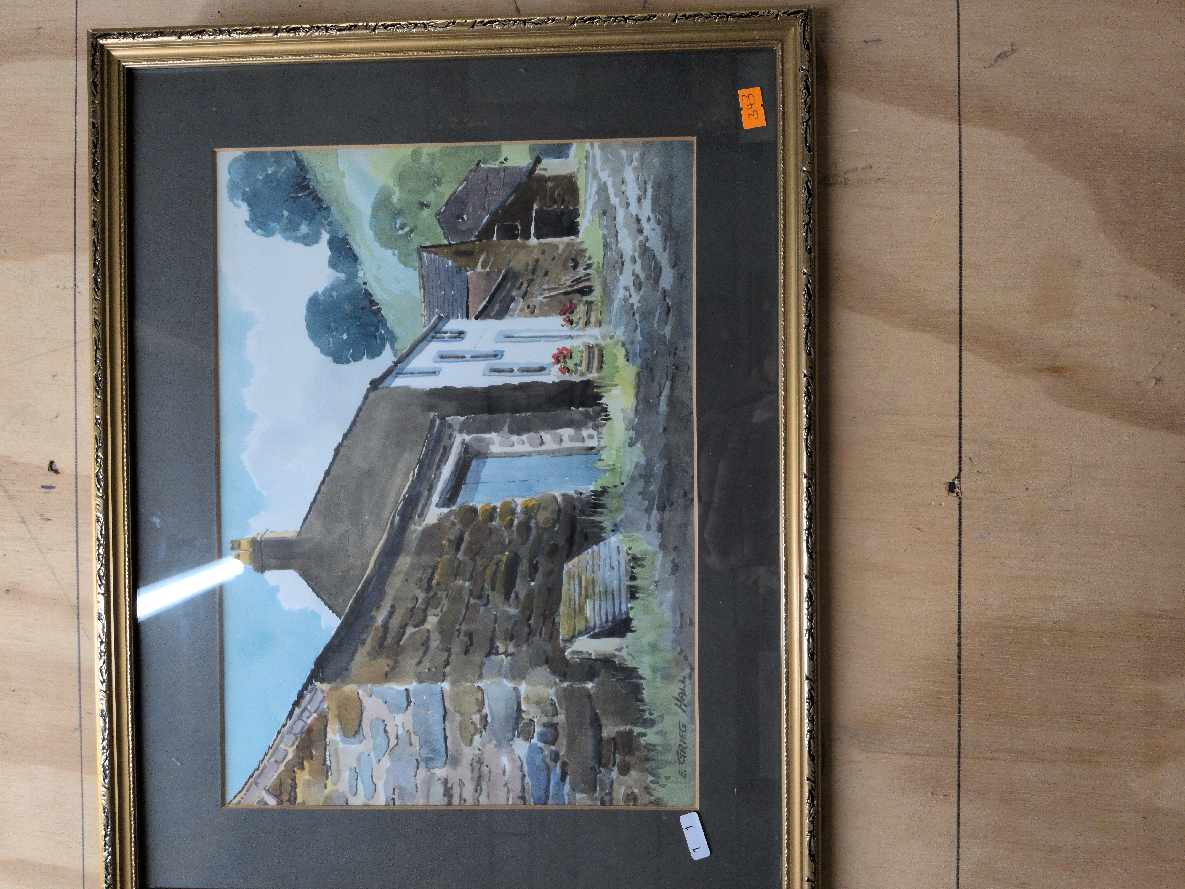 A watercolour painting with bodycolour highlights on paper by the artist E. Grieg Hall. The work depicts a traditional British rural scene featuring stone-built cottages and outbuildings nestled against a hillside. The composition is executed in a representational style using confident, loose brushwork to define the textures of the masonry and the surrounding foliage. The work is signed E. GRIEG HALL in the lower right corner. The painting is presented under glass within a dark brown mount and a gilt-moulded frame. No labels are visible on the verso.