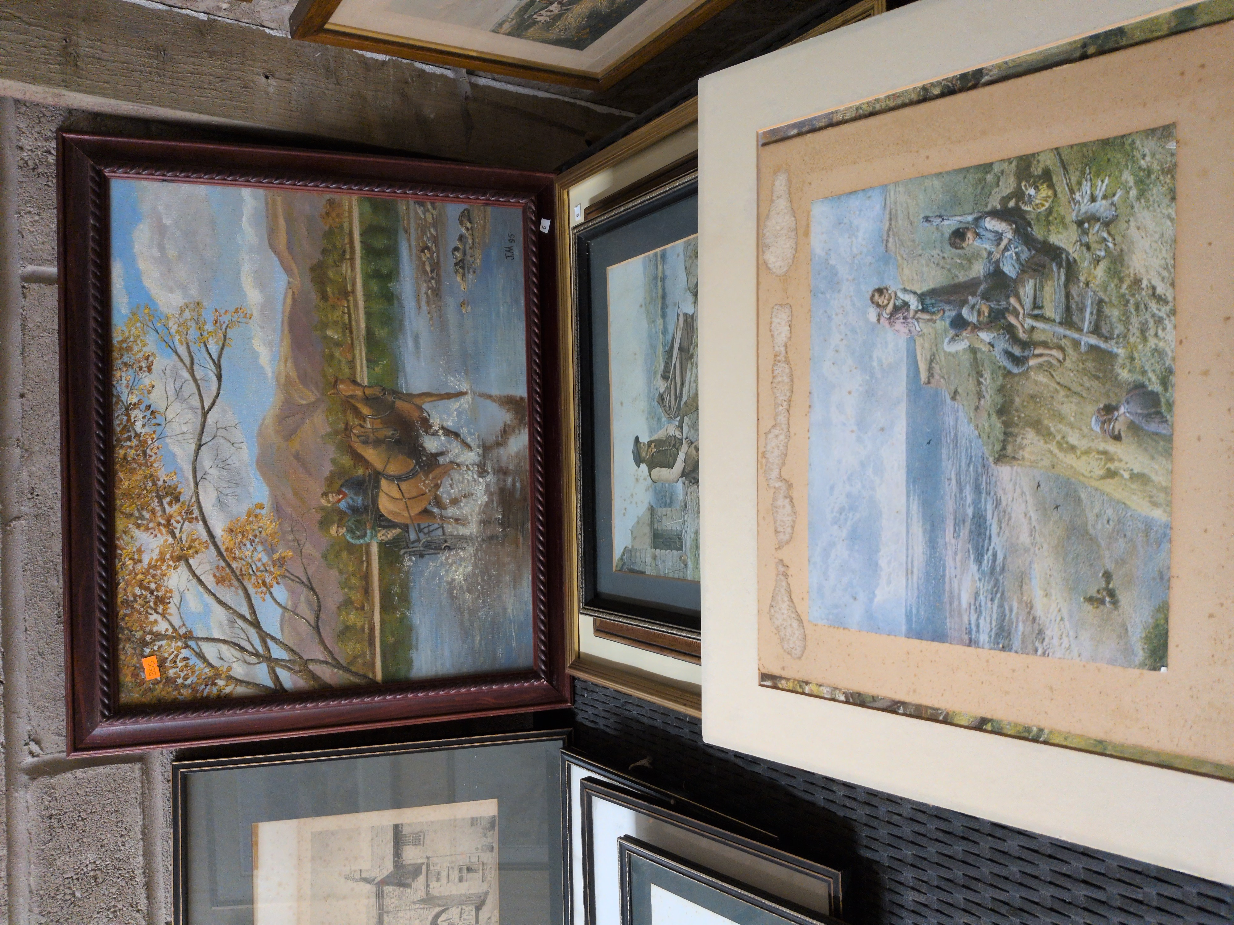 A collection of framed artworks of varying media and subjects. One work is an oil on board depicting a rural landscape with two figures in a horse-drawn cart crossing a body of water, set against a backdrop of autumnal trees and distant mountains. This work is signed and dated J.M. 95 upper right. It is housed in a dark-stained wood frame with a carved rope-twist inner border. Also included is an oil painting depicting a male figure panning for gold in a river landscape, resembling the illustrative subject The Prospector. This piece is presented in a double frame with a gilded inner border and a black outer frame. The collection further includes a work on paper, possibly a watercolour or print, depicting children on a grassy cliffside overlooking the sea, presented in a cream-coloured mount, and a monochromatic architectural print or drawing.