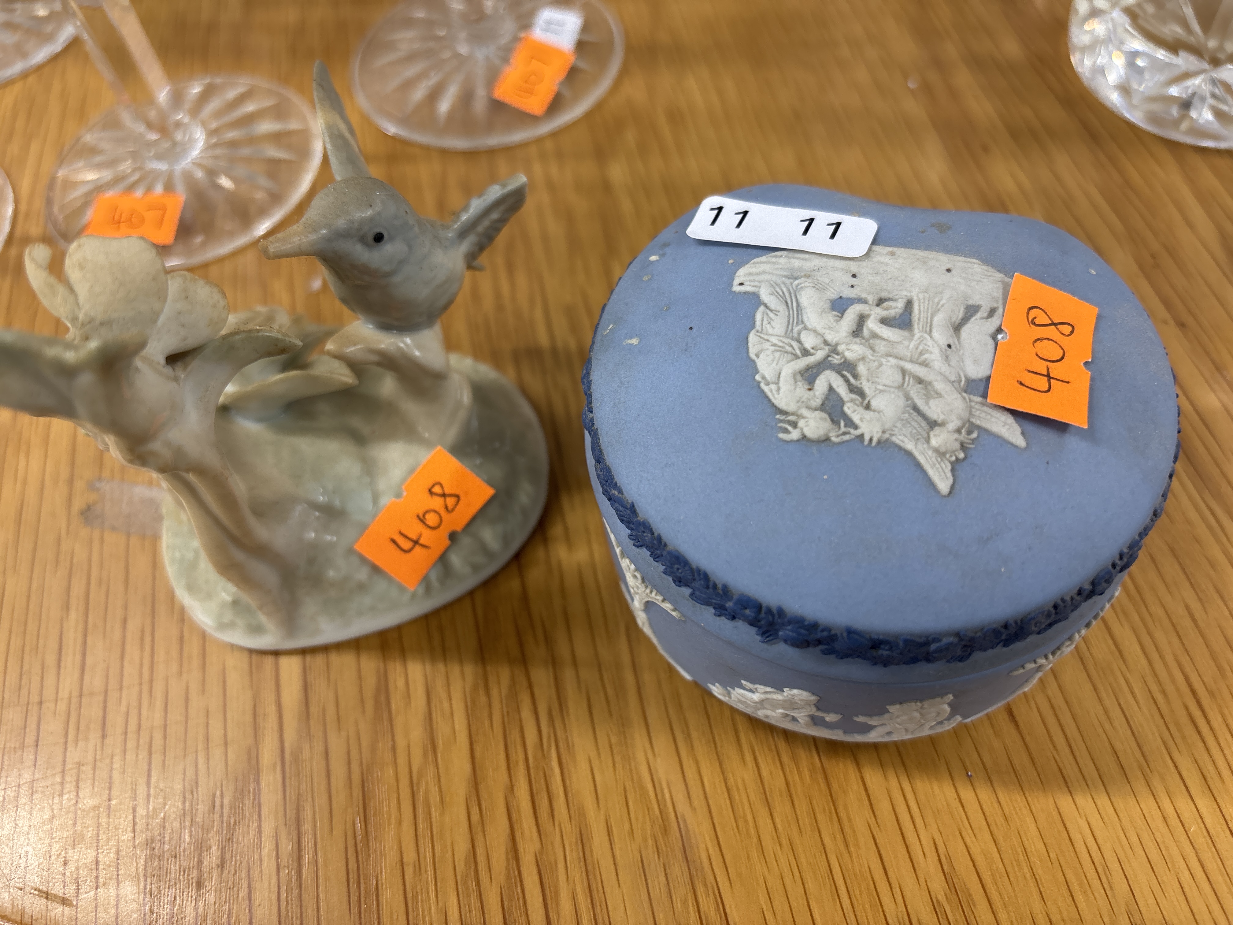 Two ceramic items comprising a circular lidded trinket box and a bird figurine. The lidded box is composed of blue Jasperware, attributed to Wedgwood, featuring a matte blue stoneware ground with applied white bas-relief neoclassical figures on the lid and a frieze of putti around the body. The lid is further decorated with a dark blue foliate border. The second item is a porcelain figurine depicting a hummingbird with spread wings positioned over a flower, finished in a semi-matte glaze with a palette of muted grey and cream tones. No maker’s marks are visible on the exterior surfaces of either piece. Both items bear orange adhesive auction labels numbered 408.