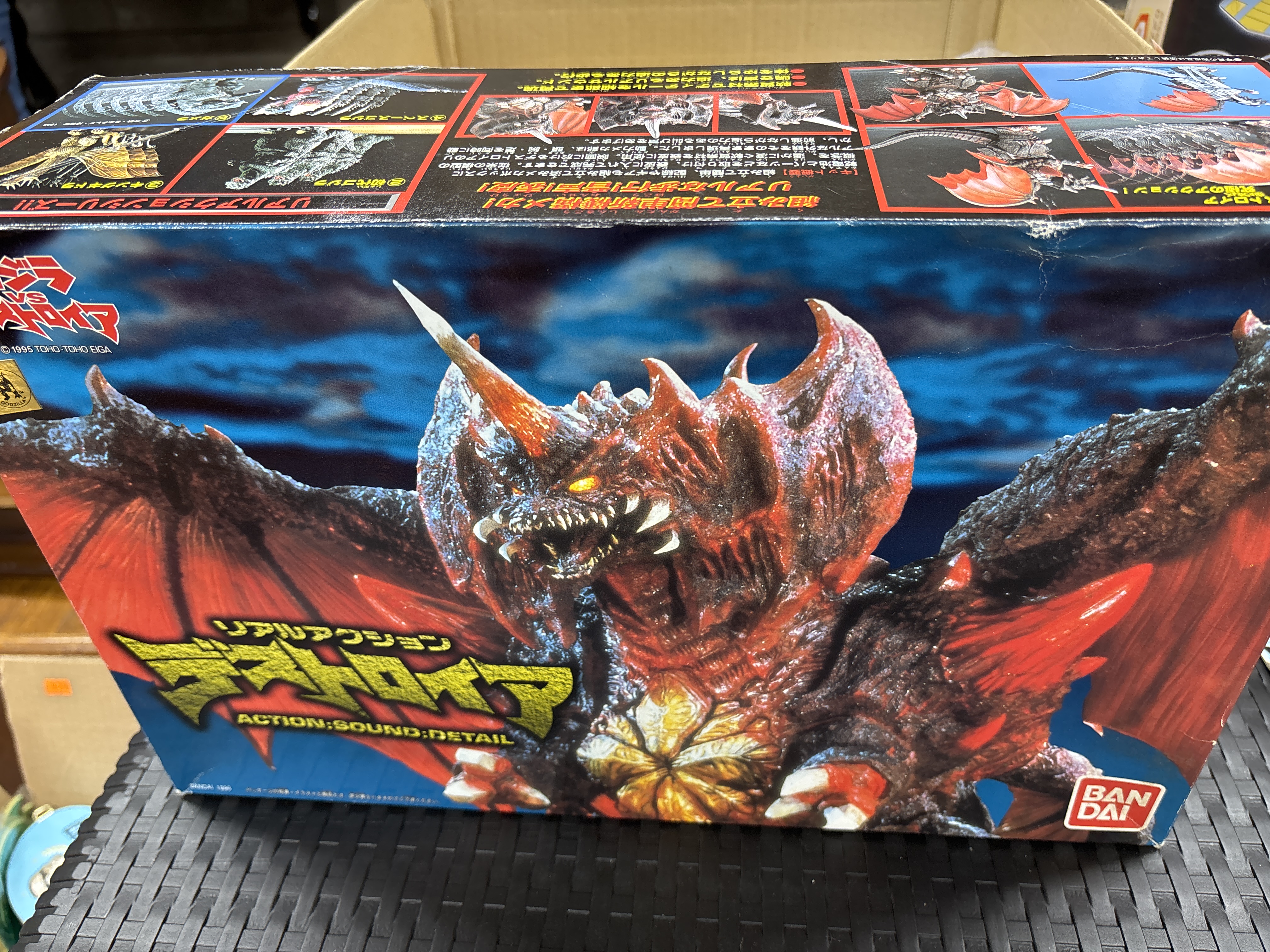 A Bandai Real Action series mechanical model kit featuring the character Destoroyah from the 1995 film Godzilla vs. Destoroyah. The item is constructed from plastic and vinyl components and is designed to feature motorised walking action and electronic sound effects as indicated by the Action-Sound-Detail branding on the packaging. The figure is presented in its original Japanese-market illustrated box which displays cinematic graphics and technical diagrams of the internal mechanical functions and assembly process. The box bears the red Bandai logo to the lower right and a copyright mark for 1995 Toho and Toho Eiga to the upper left. This item is a Japanese manufacture originally intended for the domestic market.