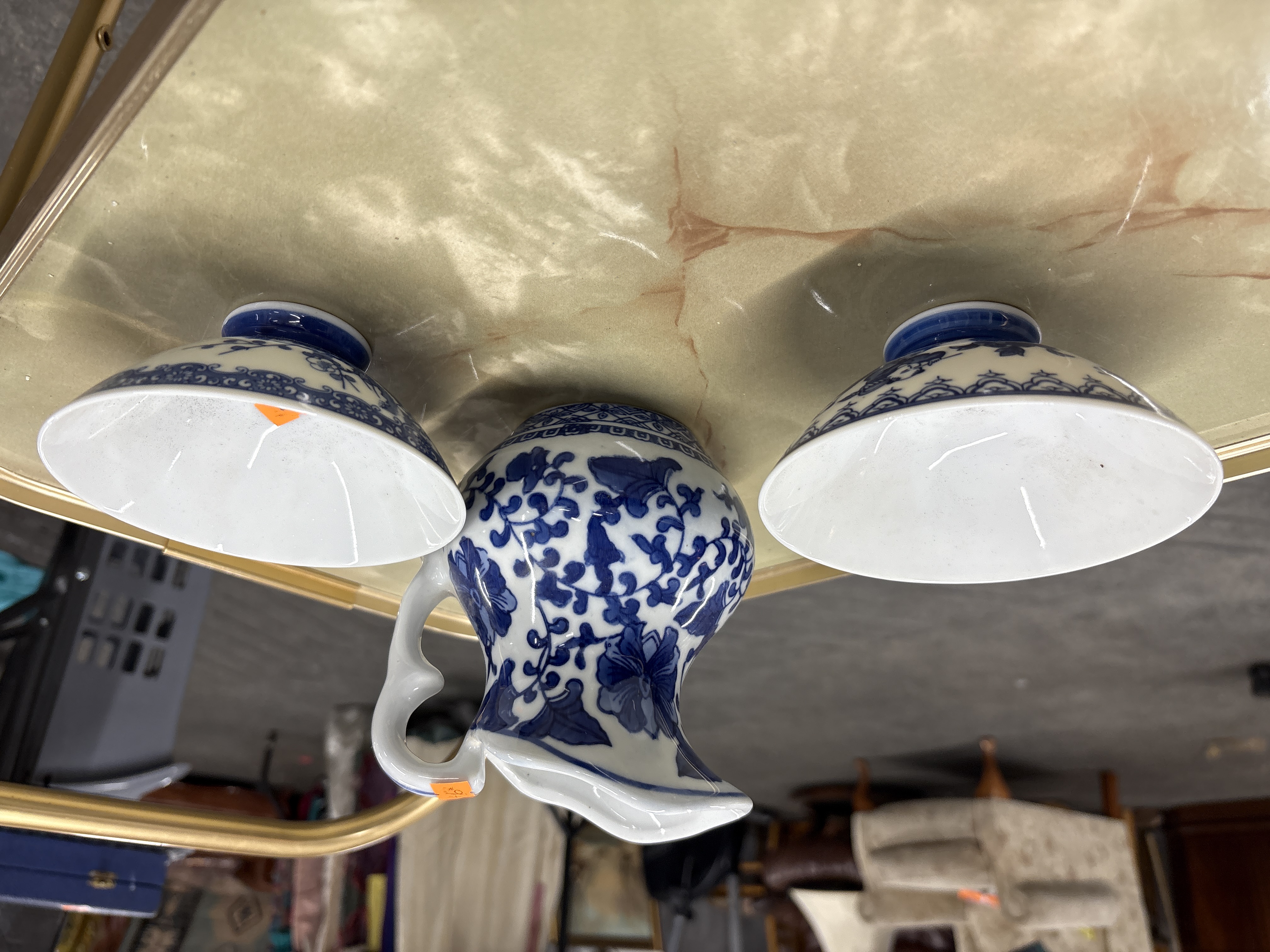 Good condition. No visible chips, cracks, or restoration. Small adhesive labels are present on the jug handle and one bowl.