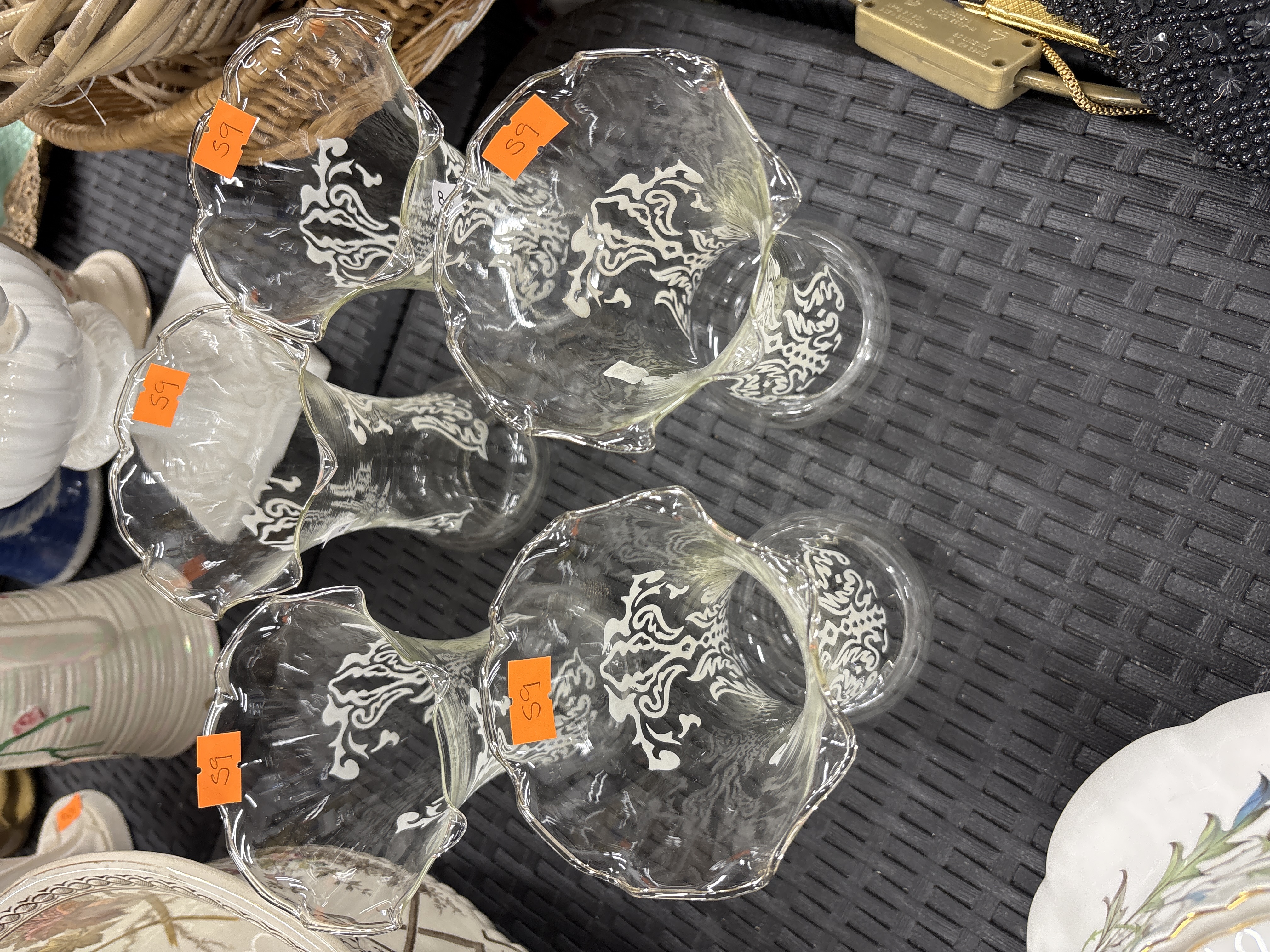 A set of five clear glass vessels in the Carmen pattern, attributed to Walther Glas of West Germany. These items are designed as epergne flutes or small decorative vases. Each piece is constructed with a wide, flared, and ruffled rim that tapers to a narrow neck and terminates in a rounded, bulbous base. The body of each vessel is decorated with a repeating symmetrical white scrolled foliate or fleur-de-lis motif. The glass is transparent and colourless. No manufacturer marks or signatures are visible on the items. Each piece bears an orange rectangular inventory sticker with the handwritten number 59. The form is reminiscent of late 19th-century Victorian epergne components.