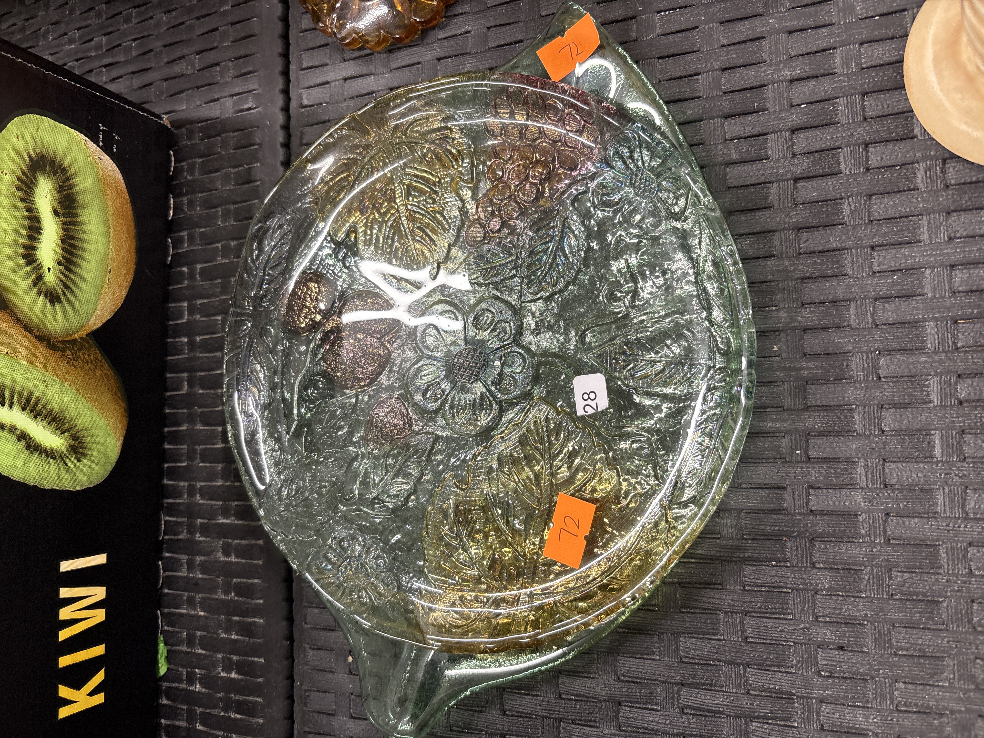 A collection of three decorative pressed glass pieces. The first item is a leaf-shaped tray in pale green carnival glass with multi-coloured metallic iridescence showing tones of pink, gold, and blue. The moulded Fruit and Flora design features a central flower, bunches of grapes, strawberries, and textured leaves, finished with an integral pointed handle. This pattern is attributed to Soga (Japan). The second item is an amber-coloured pedestal vase with a scalloped rim and arched panels containing diamond-point textures, standing on a fluted, scalloped foot. The third item is a deep amethyst footed bowl featuring a repeating hobnail texture and a flared rim; the glass appears near-black in dense areas. No manufacturer marks are visible on the surfaces or bases.