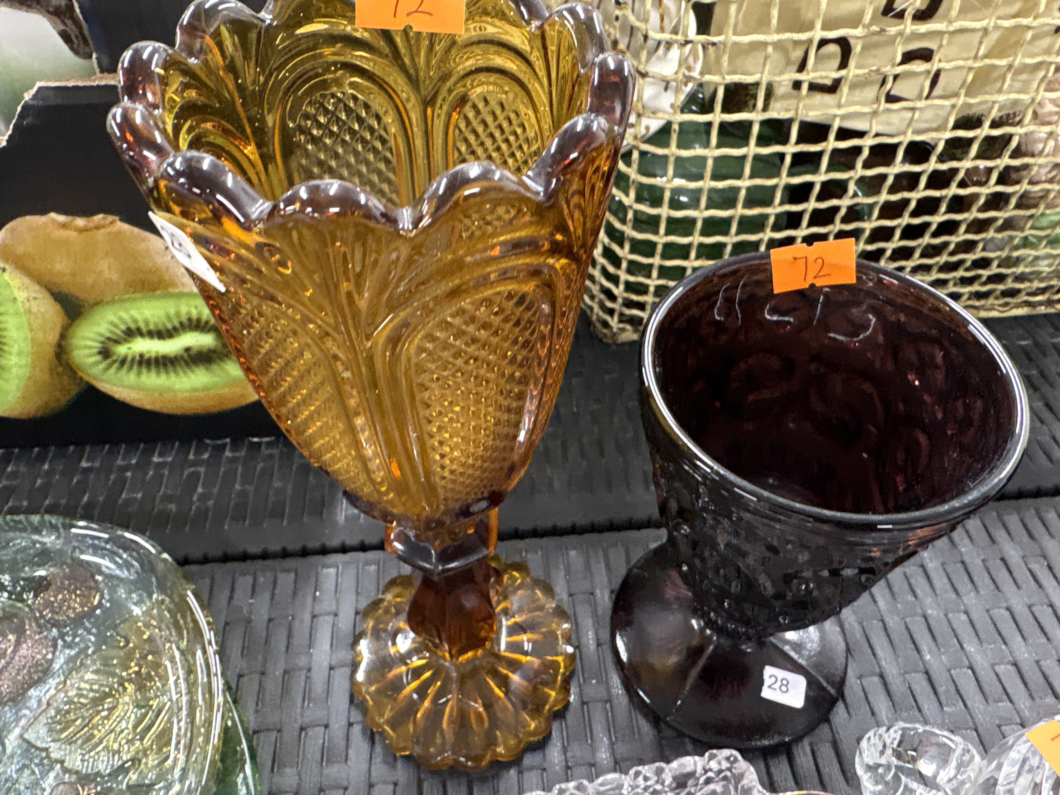 A Trio of Vintage Coloured Pressed Glass Decorative Items including Carnival Glass