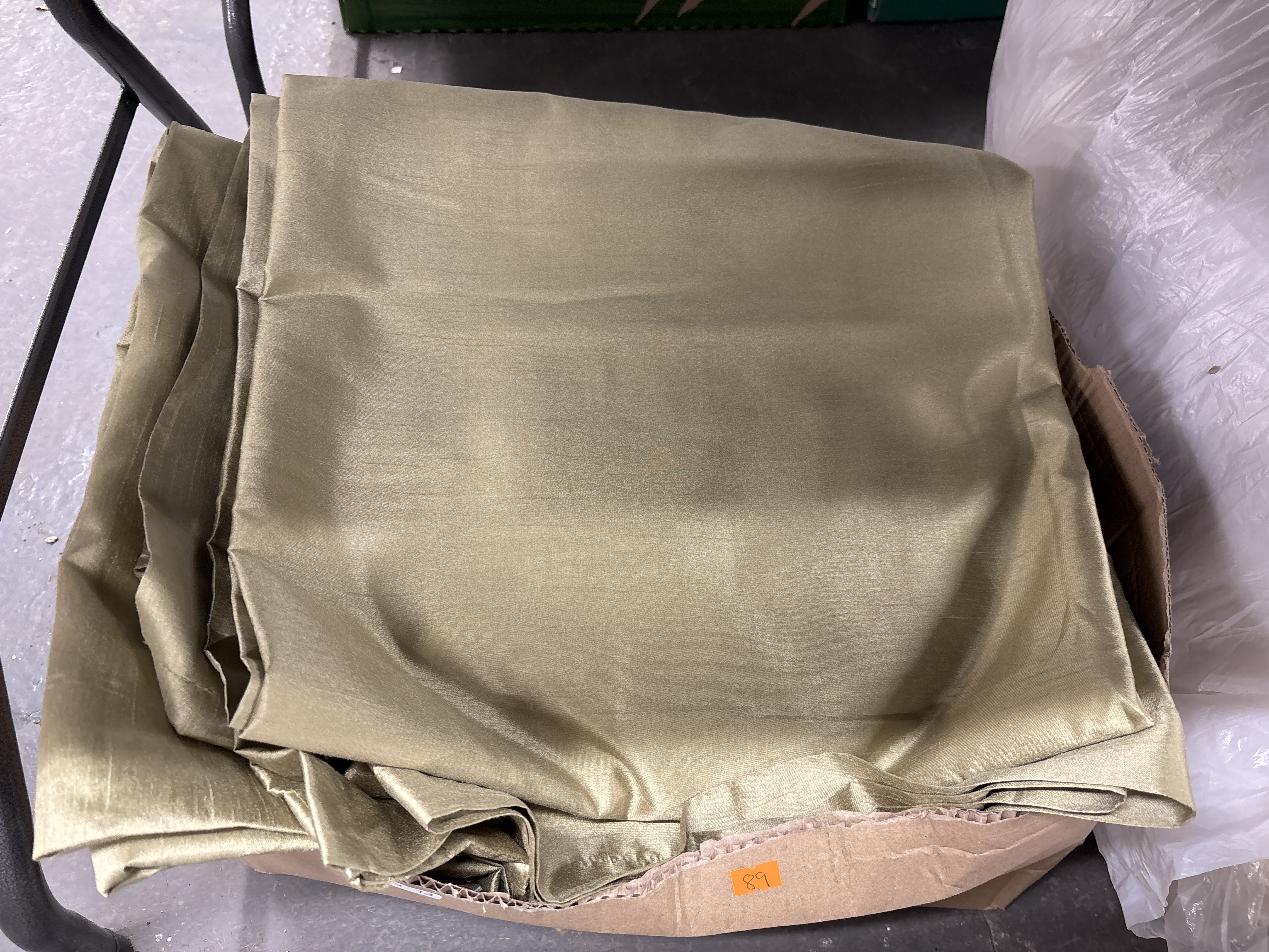 A pair of large textile panels, likely curtains or heavy drapes, featuring a slubbed texture with a pronounced metallic sheen. The material is consistent with silk shantung or a high-quality synthetic equivalent such as polyester taffeta. The fabric is a solid antique gold or olive green colour with a textured, iridescent finish. No maker marks, labels, or signatures are visible on the textile. The panels are presented folded within a cardboard container.