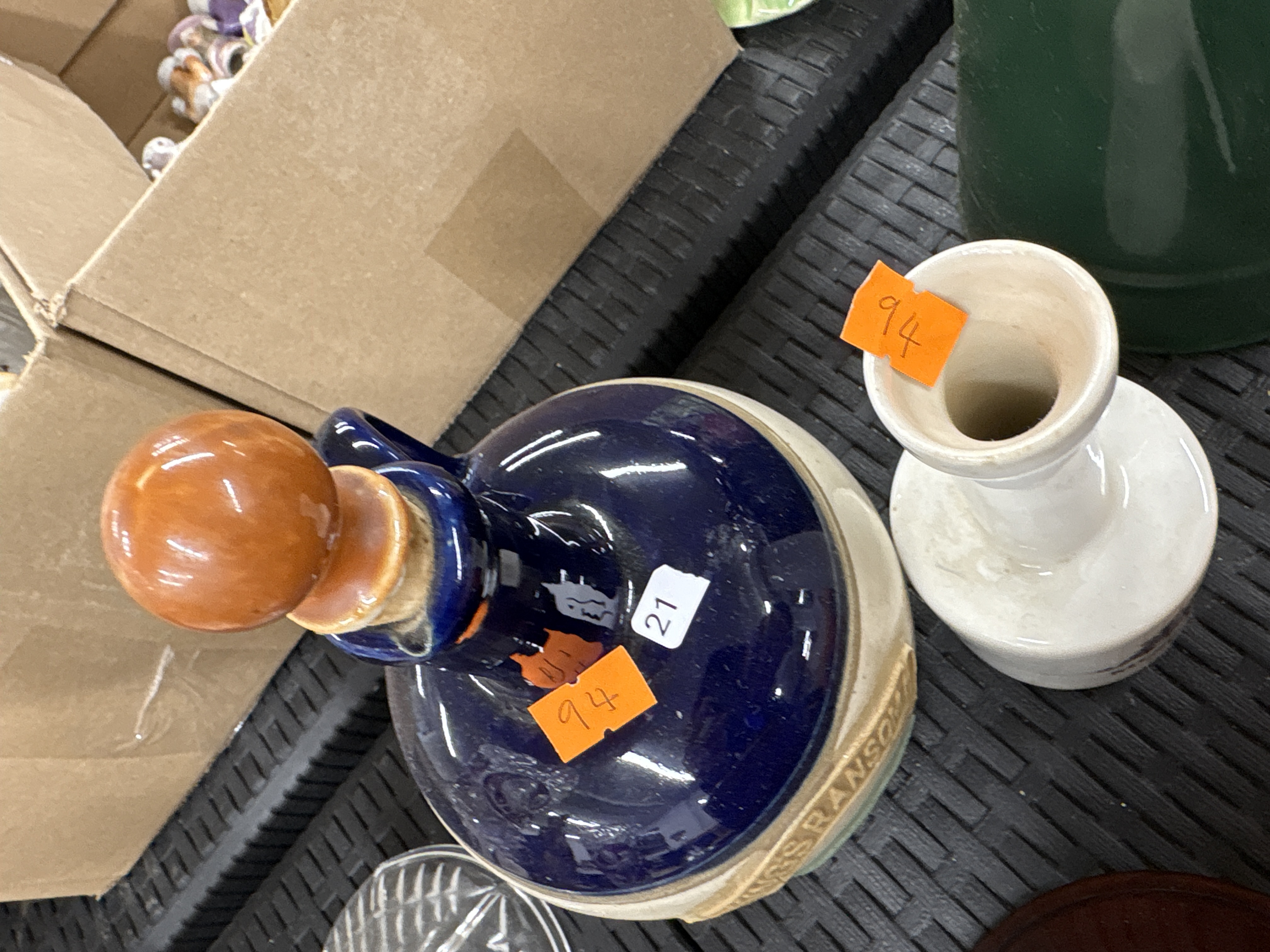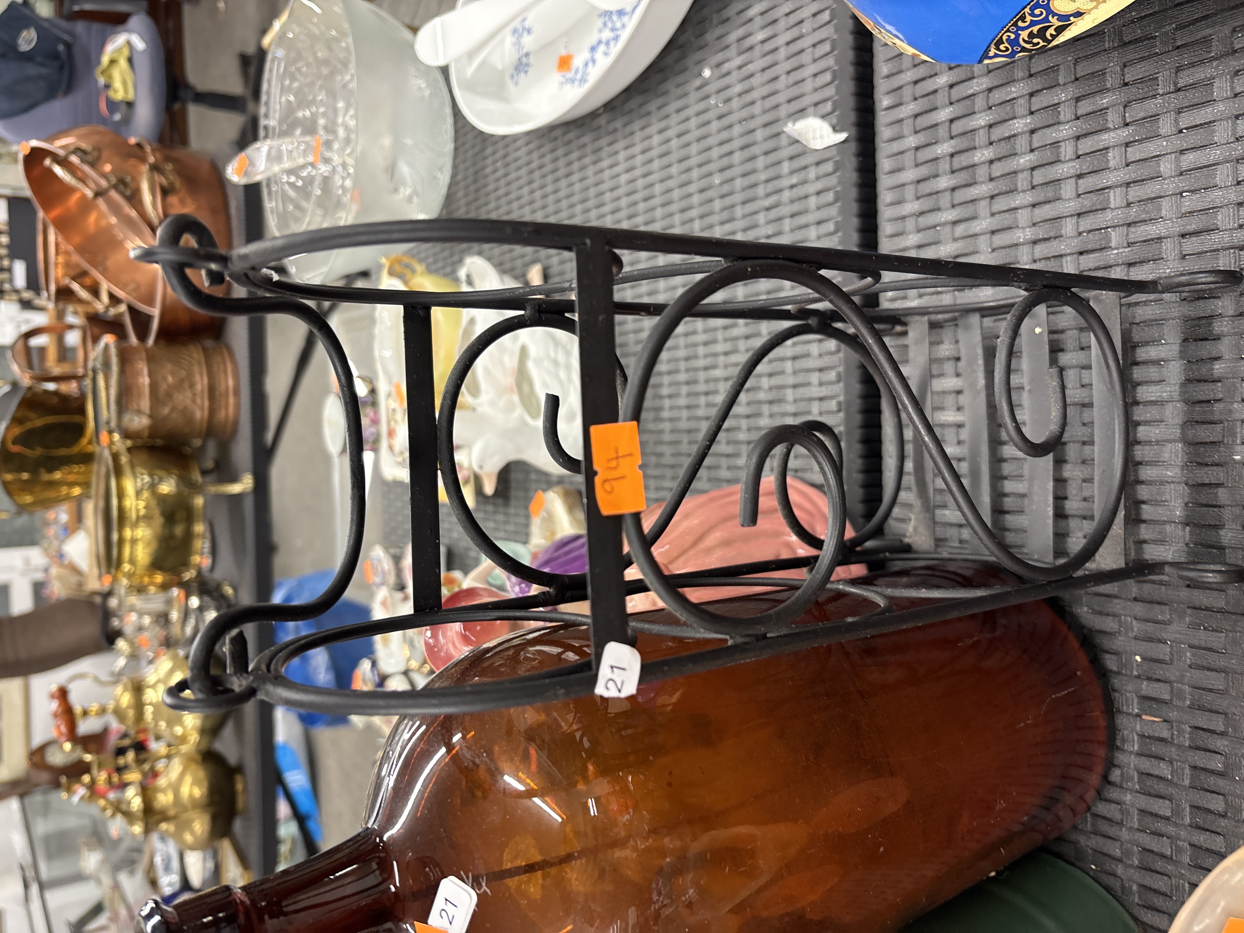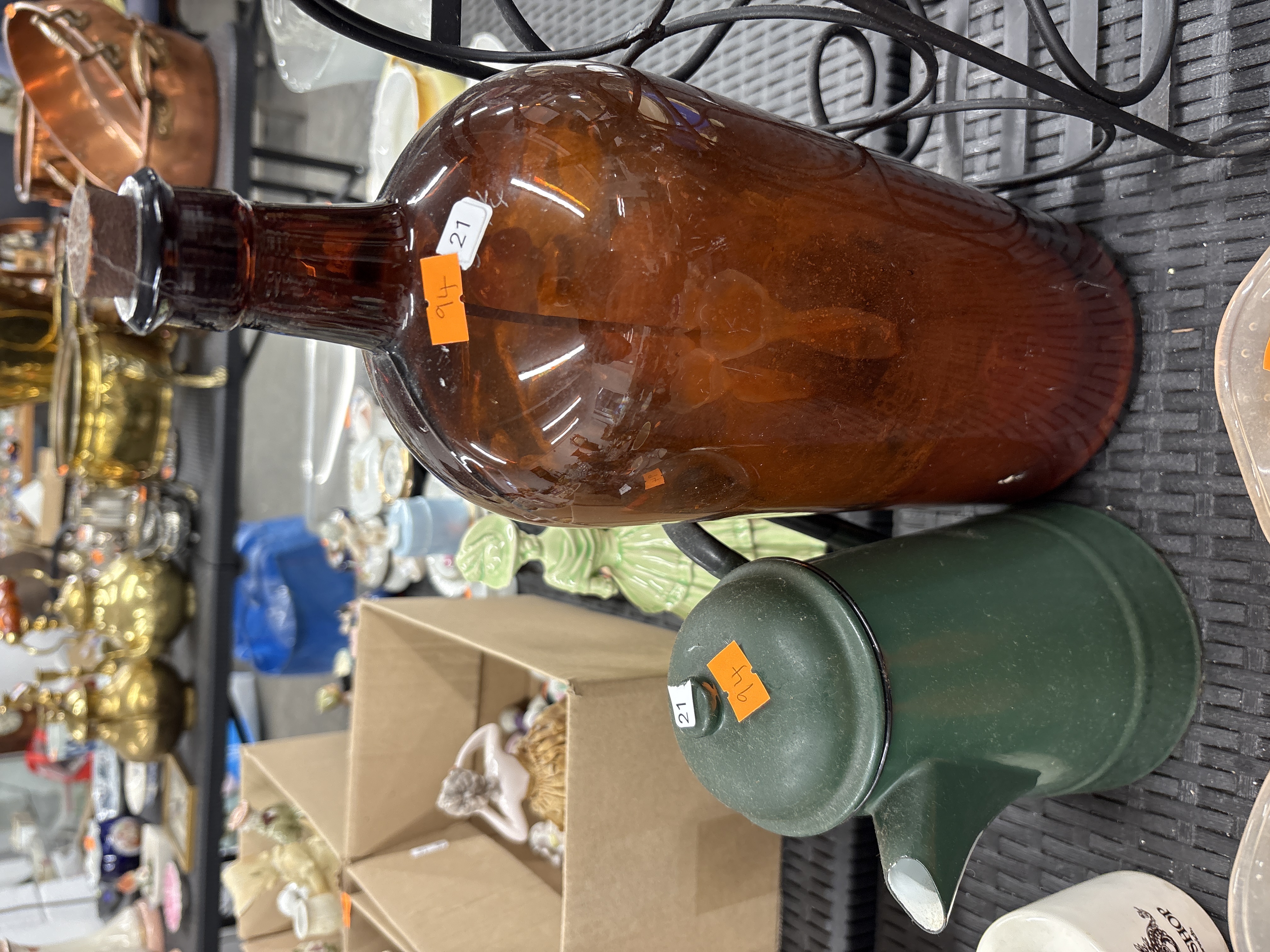 A trio of items comprising a large amber glass carboy or demijohn, a metal stand, and an enamelled pot. The carboy is of cylindrical form with a tapered neck and is fitted with a cork stopper. It rests in a black-painted wrought-style metal stand featuring scrolled decoration. The accompanying item is a green enamelled metal coffee or tea pot with a fitted lid and a white interior. No manufacturer’s marks or hallmarks are visible on the primary objects; however, they bear orange and white auction labels with handwritten numerals 94 and 21.